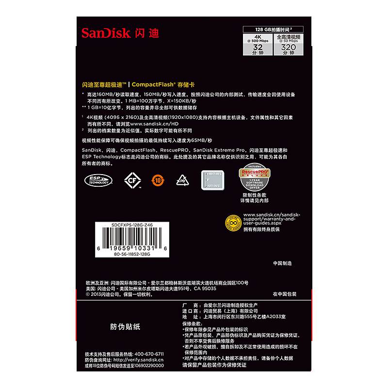 • 商品名稱:閃迪 SDCFXPS-128G-CF存儲卡128G至尊極速1067X (單位:個)